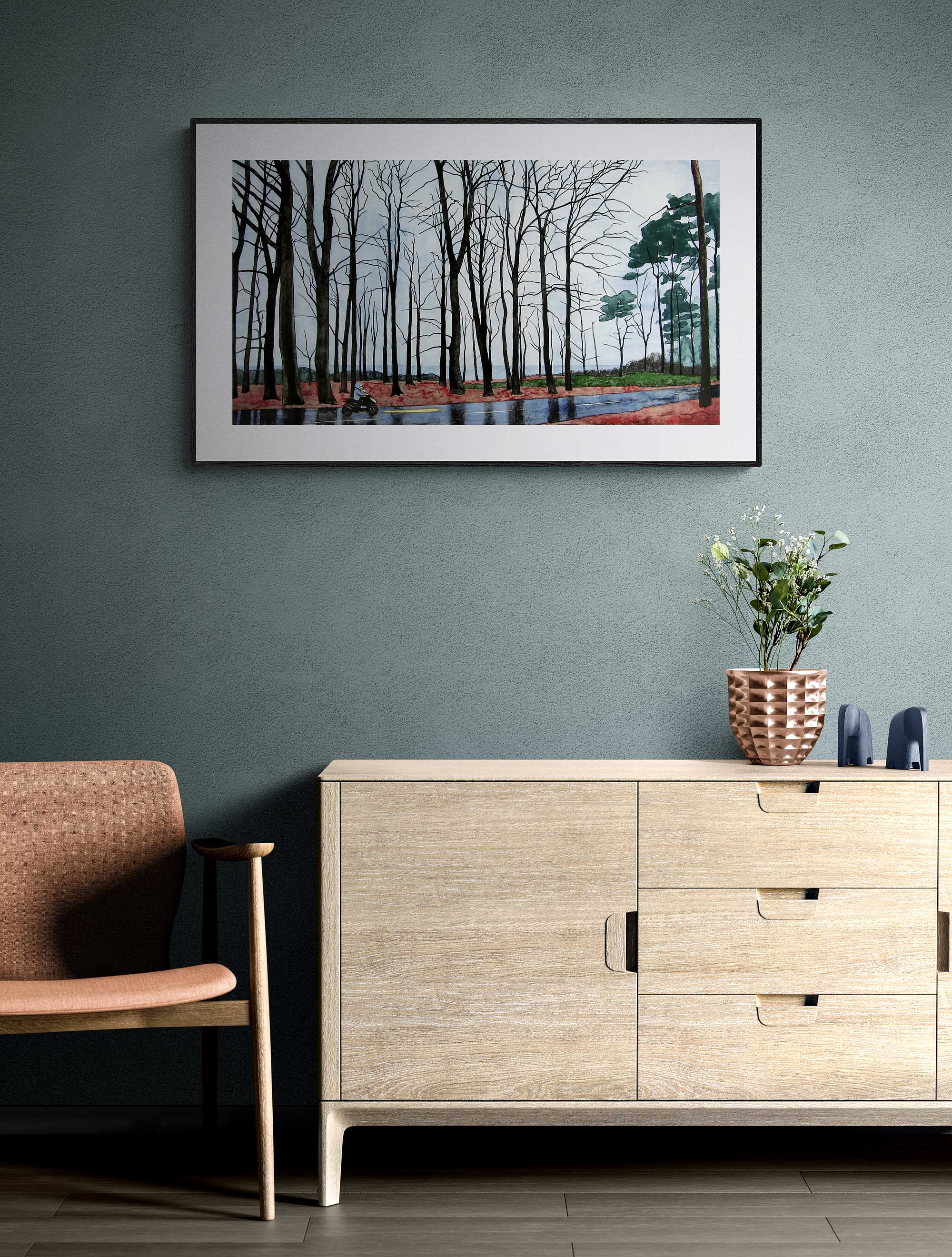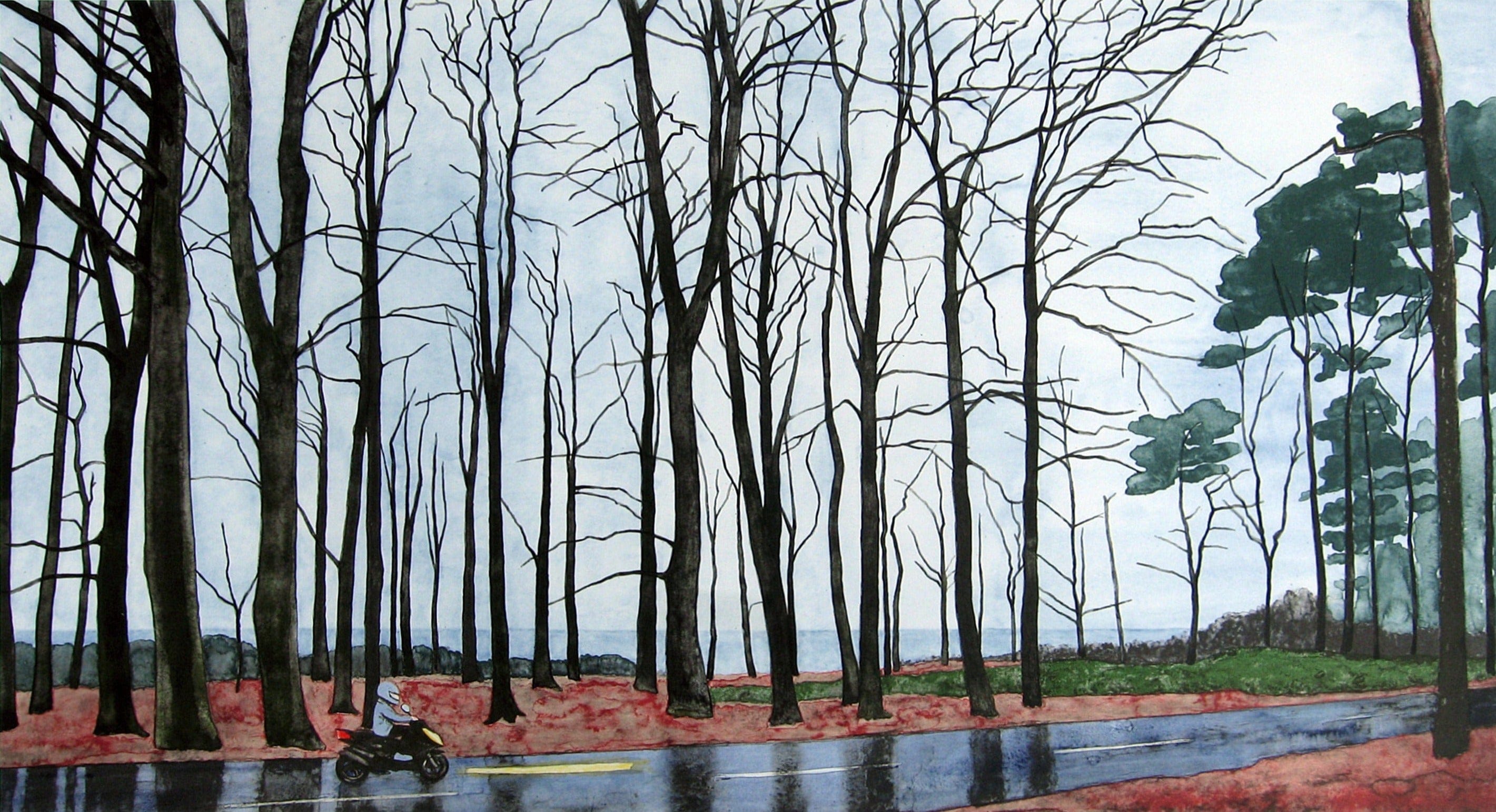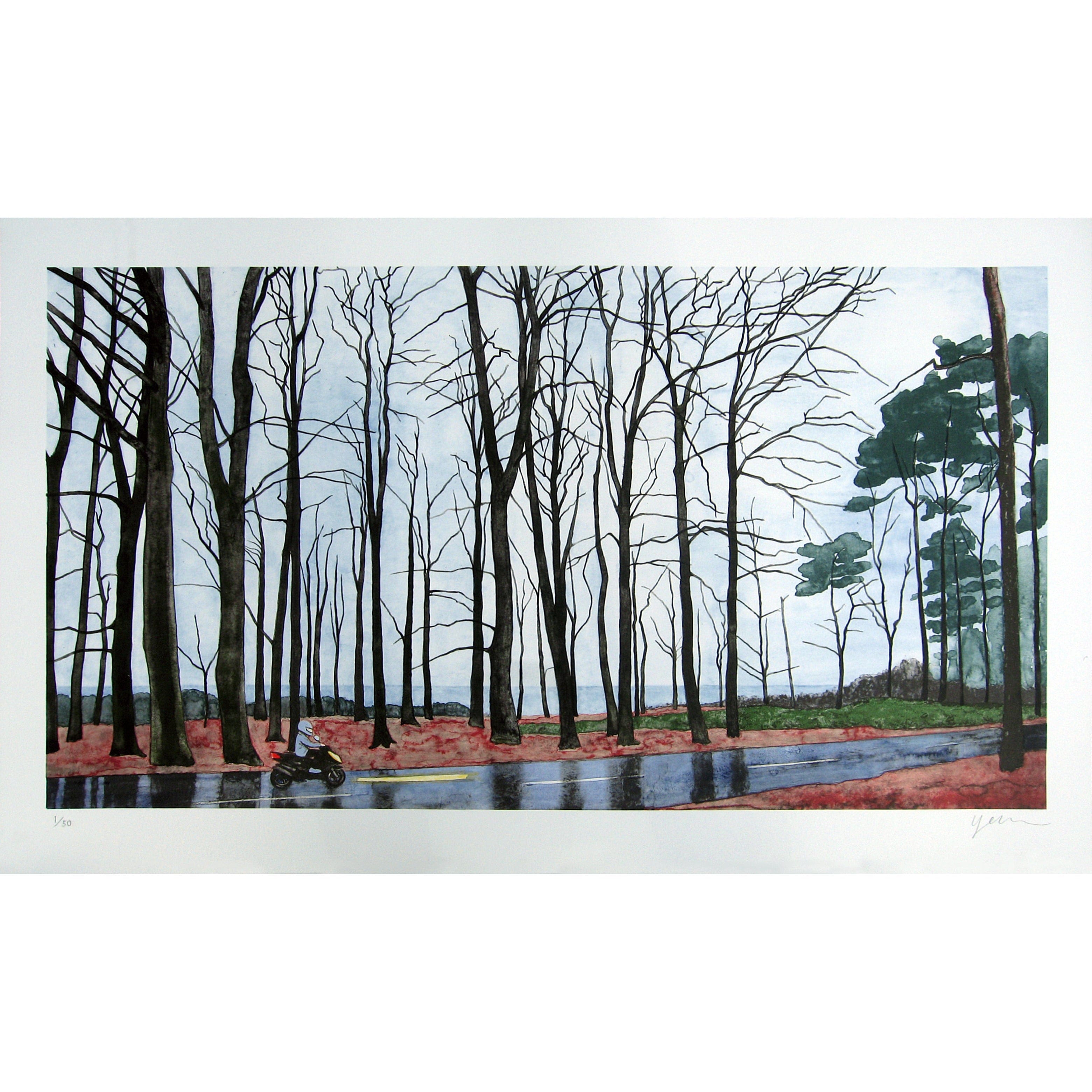 The boy on the moped in this lithography is therefore going away. He could be any teenager, anywhere in Sweden. He is not anywhere since he drives through a beech forest. The trees on the right side of the picture are pine trees. The incentive to drive through the wet weather could be a reaction of strong feelings within him. Maybe he has a final destination, or it could be an aimless drive. Serpentine Drive alludes both to the road which he is driving on, and a way of driving.”